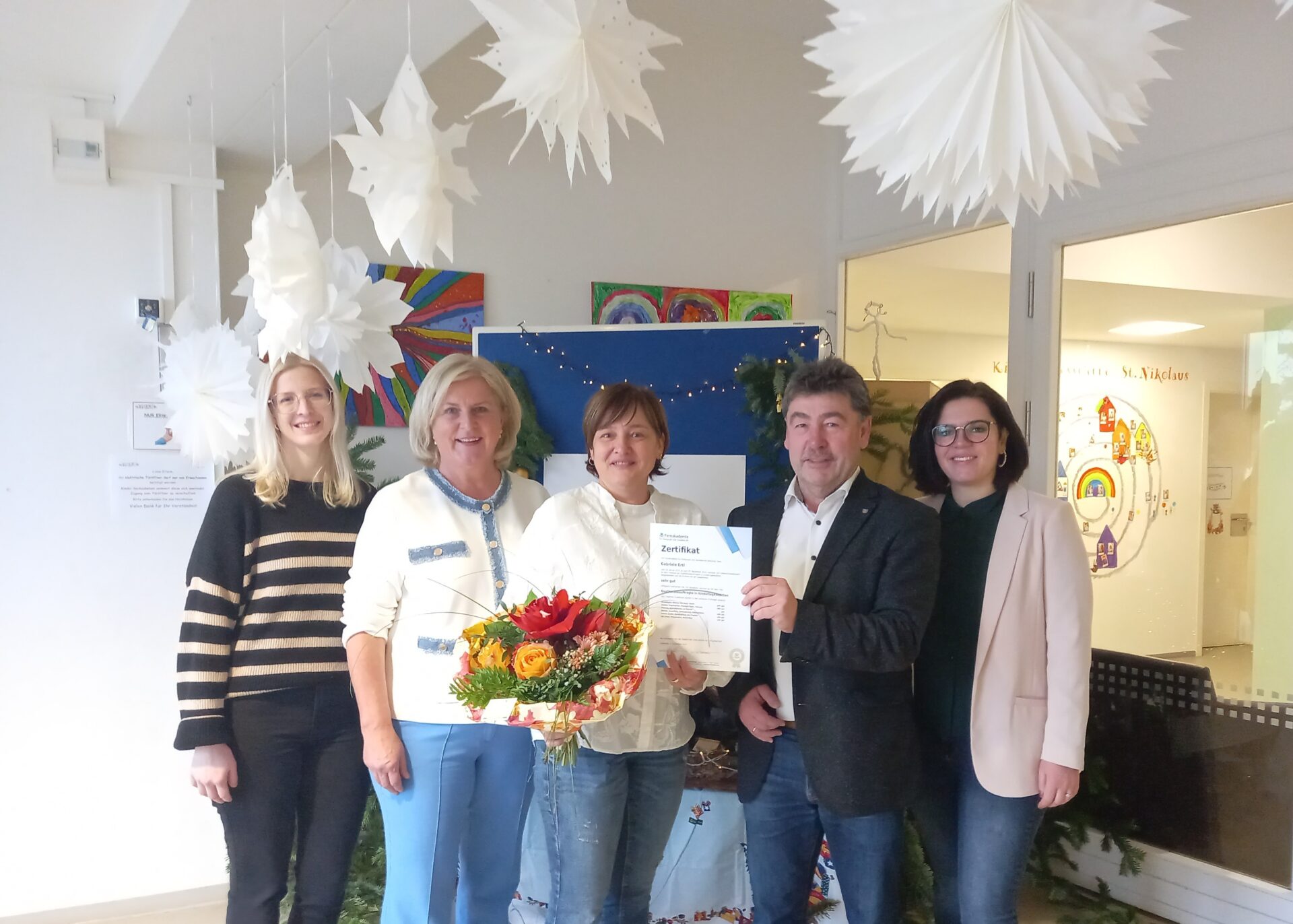 Auch die Kita-Verwaltungsfachkräfte Claudia Mayer und Elena Rauscher schlossen sich den Glückwünschen an und hoben die Wichtigkeit professioneller Weiterqualifizierung im Kitabereich hervor. Die Einrichtung freut sich, mit dem erweiterten Fachwissen von Gabriele Ertl weiterhin bestmöglich auf die Bedürfnisse der Kinder und Familien eingehen zu können.