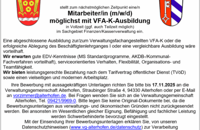 Mitarbeiter (m/w/d) für die Finanzverwaltung gesucht Die Verwaltungsgemeinschaft Aiterhofen stellt zum nächstmöglichen Zeitpunkt eine/n Mitarbeiter/in (m/w/d) in Vollzeit (ggf. auch Teilzeit möglich) im Sachgebiet Finanzen/Kassenverwaltung ein…. weiterlesen