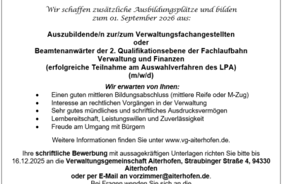 Auszubildender oder Beamtenanwärter (m/w/d) gesucht Verwaltungsgemeinschaft Aiterhofen (ca. 6.300 Einwohner)-Mitgliedsgemeinden Aiterhofen und Salching- Wir schaffen zusätzliche Ausbildungsplätze und bilden zum 01. September 2026 aus: Auszubildende/r… weiterlesen