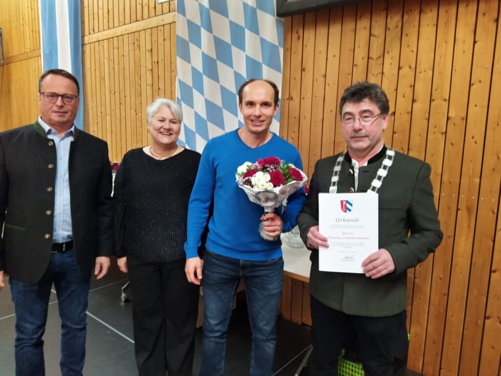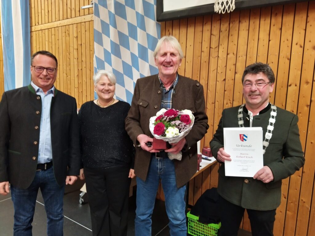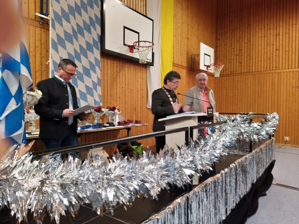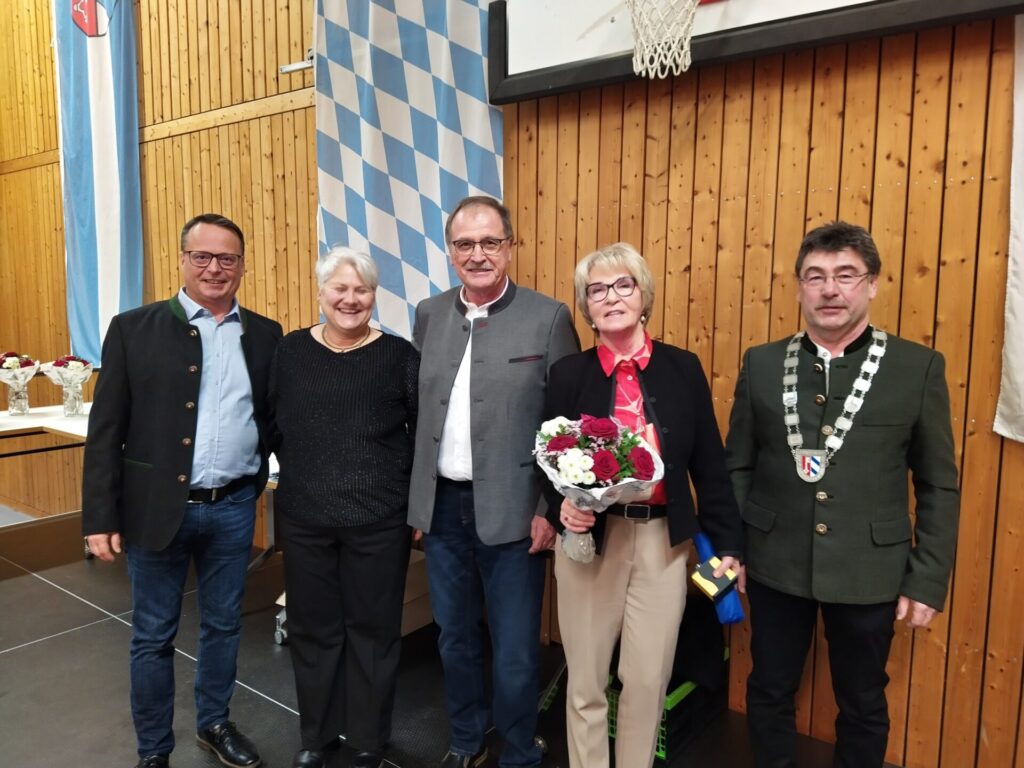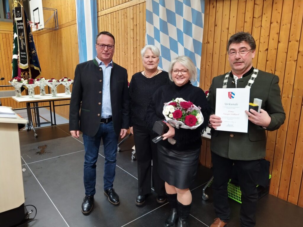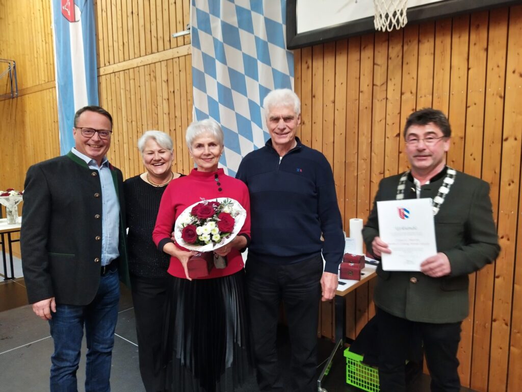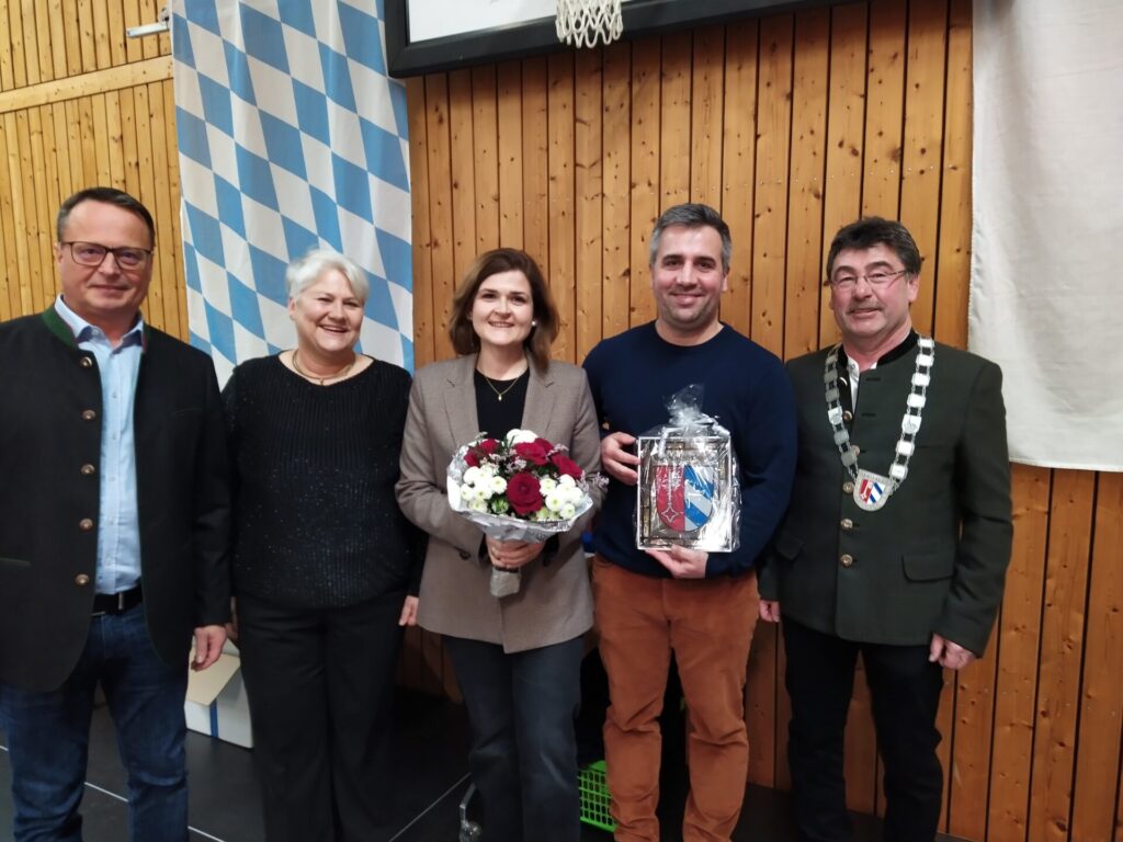 Ein besonderer Höhepunkt des Abends war die Ehrung verdienter Bürgerinnen und Bürger. Die Ehrenplakette der Gemeinde erhielt Ferdinand Breu aus Piering für seine 26-jährige Tätigkeit als Jagdvorsteher. Die Ehrennadel in Gold wurde an Dagmar Genau verliehen, die sich seit über 20 Jahren in vielfältiger Weise für den Obst- und Gartenbauverein Salching, den Katholischen Deutschen Frauenbund sowie die Pfarrei engagiert. Ohne ihren Einsatz wären zahlreiche kirchliche und soziale Veranstaltungen nicht denkbar. Mit der Ehrennadel in Silber wurden ausgezeichnet: Benjamin Baran (FFW Oberpiebing), Petra Dengler (KDFB), Harald Hollermeier (KSK Oberpiebing), Thomas Hollermeier (FFW Oberpiebing), Florian Kern (FFW Oberpiebing), Florian Stadler (FFW Oberpiebing), Thomas Wenninger (KSK Oberpiebing), Robert Wittke (KSK Oberpiebing) sowie Michaela Zehentbauer-Hilmer (KDFB). Ein bewegender Moment war der Abschied von Hausarzt Dr. Hans Ertl, der über mehr als 40 Jahre gemeinsam mit seiner Frau Angela für die Menschen der Gemeinde da war. Gleichzeitig stellte Bürgermeister Neumeier mit Anne-Marie Feldmeier die Nachfolgerin vor, die die Praxis ab sofort übernimmt. Weitere Leistungen wurden gewürdigt: Leo Mauerer hat den Staatspreis als Kochabsolvent als bester Koch erhalten, Tanja Volkert wurde für ihren überdurchschnittlichen Abschluss mit einem Notendurchschnitt von 1,1 als Fachkraft für Hauswirtschaft gewürdigt. Bei den anschließenden Sportlerehrungen wurden ausgezeichnet: Herta und Franz Xaver Geith (4. Platz bei der Landesmeisterschaft im Tanz), Robert Koch (3. Platz Deutsche Meisterschaft im Zielfernrohrschießen), Luisa Lang (2. Und 3. Platz Deutschlandcup im Eisschwimmen und WM-Teilnahme), Ilona Wolf (3. Platz Landesmeisterschaft im Poolbillard) sowie Florian Zimmermann (3. Platz Deutsche Meisterschaft im Skilanglauf über 10 km). Den Abschluss des Neujahrsempfangs bildeten die guten Wünsche des Pfarrers und Bürgermeisters für das neue Jahr sowie das gemeinsame Singen der Bayernhymne, musikalisch begleitet vom Musikverein Salching–Oberpiebing. Die Anwesenden nutzten nun die Gelegenheit in geselliger Runde Gedankenaustausch, Nachbarschaftserfahrungen und Dorfereignisse zu besprechen.