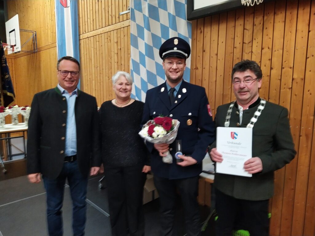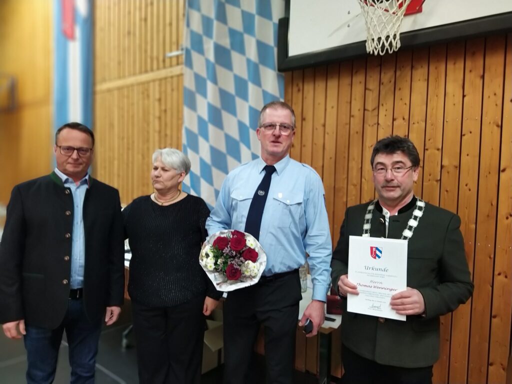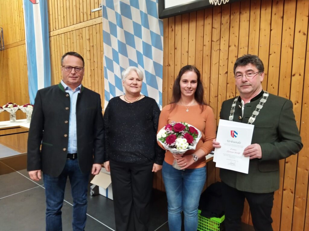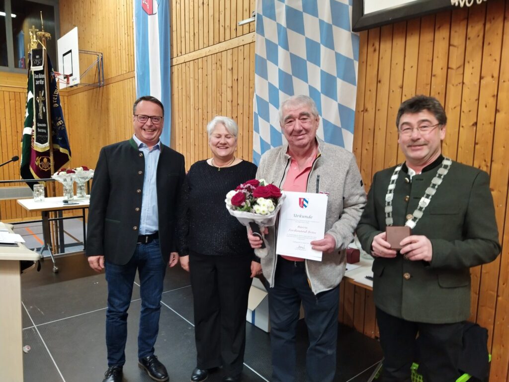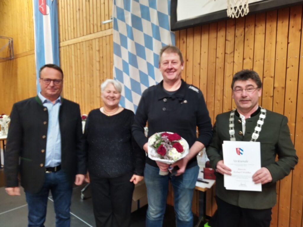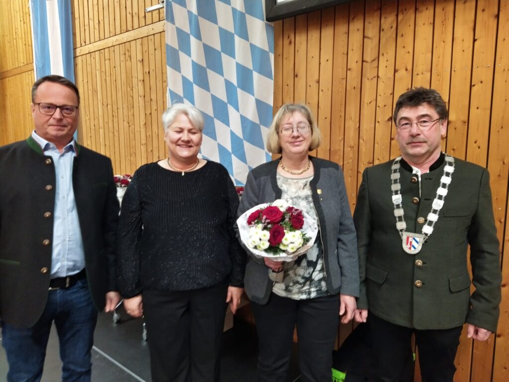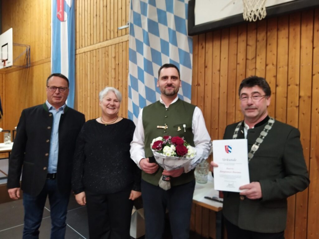 Ein besonderer Höhepunkt des Abends war die Ehrung verdienter Bürgerinnen und Bürger. Die Ehrenplakette der Gemeinde erhielt Ferdinand Breu aus Piering für seine 26-jährige Tätigkeit als Jagdvorsteher. Die Ehrennadel in Gold wurde an Dagmar Genau verliehen, die sich seit über 20 Jahren in vielfältiger Weise für den Obst- und Gartenbauverein Salching, den Katholischen Deutschen Frauenbund sowie die Pfarrei engagiert. Ohne ihren Einsatz wären zahlreiche kirchliche und soziale Veranstaltungen nicht denkbar. Mit der Ehrennadel in Silber wurden ausgezeichnet: Benjamin Baran (FFW Oberpiebing), Petra Dengler (KDFB), Harald Hollermeier (KSK Oberpiebing), Thomas Hollermeier (FFW Oberpiebing), Florian Kern (FFW Oberpiebing), Florian Stadler (FFW Oberpiebing), Thomas Wenninger (KSK Oberpiebing), Robert Wittke (KSK Oberpiebing) sowie Michaela Zehentbauer-Hilmer (KDFB). Ein bewegender Moment war der Abschied von Hausarzt Dr. Hans Ertl, der über mehr als 40 Jahre gemeinsam mit seiner Frau Angela für die Menschen der Gemeinde da war. Gleichzeitig stellte Bürgermeister Neumeier mit Anne-Marie Feldmeier die Nachfolgerin vor, die die Praxis ab sofort übernimmt. Weitere Leistungen wurden gewürdigt: Leo Mauerer hat den Staatspreis als Kochabsolvent als bester Koch erhalten, Tanja Volkert wurde für ihren überdurchschnittlichen Abschluss mit einem Notendurchschnitt von 1,1 als Fachkraft für Hauswirtschaft gewürdigt. Bei den anschließenden Sportlerehrungen wurden ausgezeichnet: Herta und Franz Xaver Geith (4. Platz bei der Landesmeisterschaft im Tanz), Robert Koch (3. Platz Deutsche Meisterschaft im Zielfernrohrschießen), Luisa Lang (2. Und 3. Platz Deutschlandcup im Eisschwimmen und WM-Teilnahme), Ilona Wolf (3. Platz Landesmeisterschaft im Poolbillard) sowie Florian Zimmermann (3. Platz Deutsche Meisterschaft im Skilanglauf über 10 km). Den Abschluss des Neujahrsempfangs bildeten die guten Wünsche des Pfarrers und Bürgermeisters für das neue Jahr sowie das gemeinsame Singen der Bayernhymne, musikalisch begleitet vom Musikverein Salching–Oberpiebing. Die Anwesenden nutzten nun die Gelegenheit in geselliger Runde Gedankenaustausch, Nachbarschaftserfahrungen und Dorfereignisse zu besprechen.