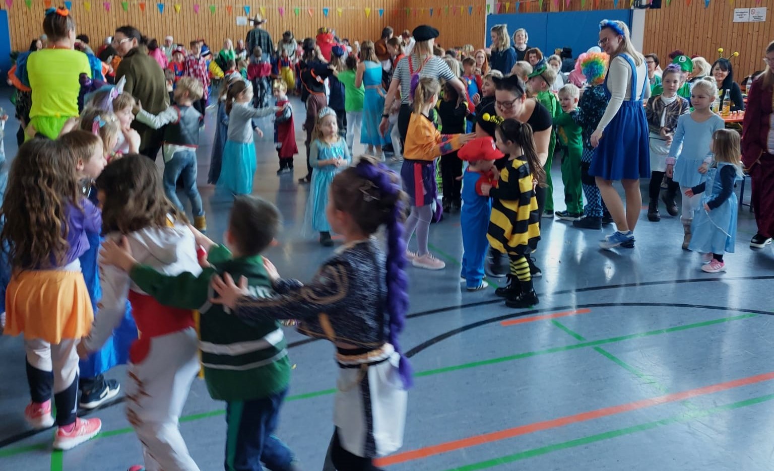 Für die musikalische Umrahmung sorgten Lukas und Michael Bumes, die mit ihrer Musikmaschine kindgerechte Disco- und Stimmungsmusik auflegten. Schnell füllte sich die Tanzfläche, auf der die kleinen Narren ausgelassen feierten. Die Animatoren des Frauenbundes, Andrea und Lena Kubiciel sowie Nicole Beetschen, führten mit viel Schwung und guter Laune zahlreiche Tanz- und Bewegungsspiele durch.