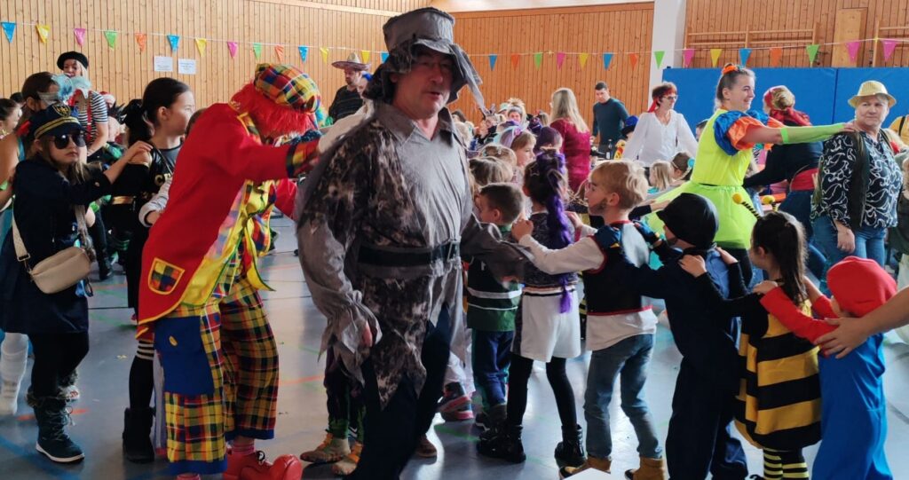 Besonders bei Klassikern wie dem „Fliegerlied“ oder der „Reise nach Jerusalem“ ließen sich auch Eltern und Großeltern zum Mitmachen animieren. Die Freude und Begeisterung der Kinder waren dabei der schönste Dank für die vielen Stunden der Vorbereitung. Auch Pfarrer Heinrich Weber ließ es sich nicht nehmen, dem närrischen Treiben einen Besuch abzustatten.