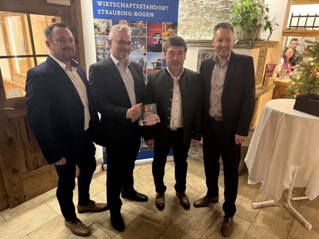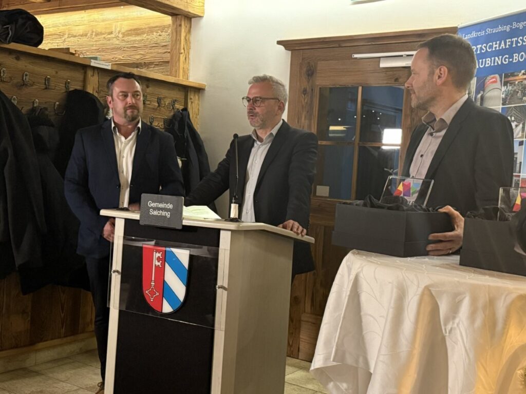 Drei Unternehmen aus dem Landkreis sicherten sich einmal mehr den begehrten Preis. Davon auch ein Unternehmen aus der Gemeinde Salching. Bürgermeister Neumeier war sichtlich stolz bei seiner Laudatio für die Fa. Encory. Mit dem Satz „Wir haben glei gmerkt, dass Encory und Salching zusammenpassen“ leitete er die Laudatio ein. Neumeier erinnerte an den vergangenen Jahreswechsel als es darum ging, die Fa. Encory nach Salching zu holen. Kurz vor Weihnachten 2025 war es, als Gemeinde, Landkreis, Familie Sturm und die Encory-Vertreter alle an einem Strang zogen um das Joint-Venture aus BMW und Interzero nach Salching zu holen. Neumeier betonte, dass es ihn besonders Stolz macht nur ein Jahr später die Laudatio auf das Unternehmen halten zu dürfen. Encory ist spezialisiert auf Kreislaufwirtschaft in der Industrie. In Salching arbeitet Encory an einem Pilotprojekt in Sachen Batterierecycling welches nach Angaben der Firma einzigartig auf der Welt ist. Gemeinsam mit BMW ist das Ziel, nach erfolgter Pilotierung das Unternehmen am Standort Salching weiter auszubauen und von der Gemeinde aus in die ganze Welt zu schauen. „Encory ist ein weiterer Baustein unseres Industriestandortes Salching“ betonte Neumeier. Mit den Dankesworten an alle Beteiligten die an der schnellen Ansiedlung mitgeholfen haben schloss Neumeier seine Laudatio ab. Anschließend wurde durch Hr. Staatsminister Georg Eisenreich, Hr. Dr. Reinhard Saller vom Niederbayern-Forum, Regierungspräsident Rainer Haselbeck, Landrat Josef Laumer und Bürgermeister Neumeier die Auszeichnung an die Fa. Encory übergeben.